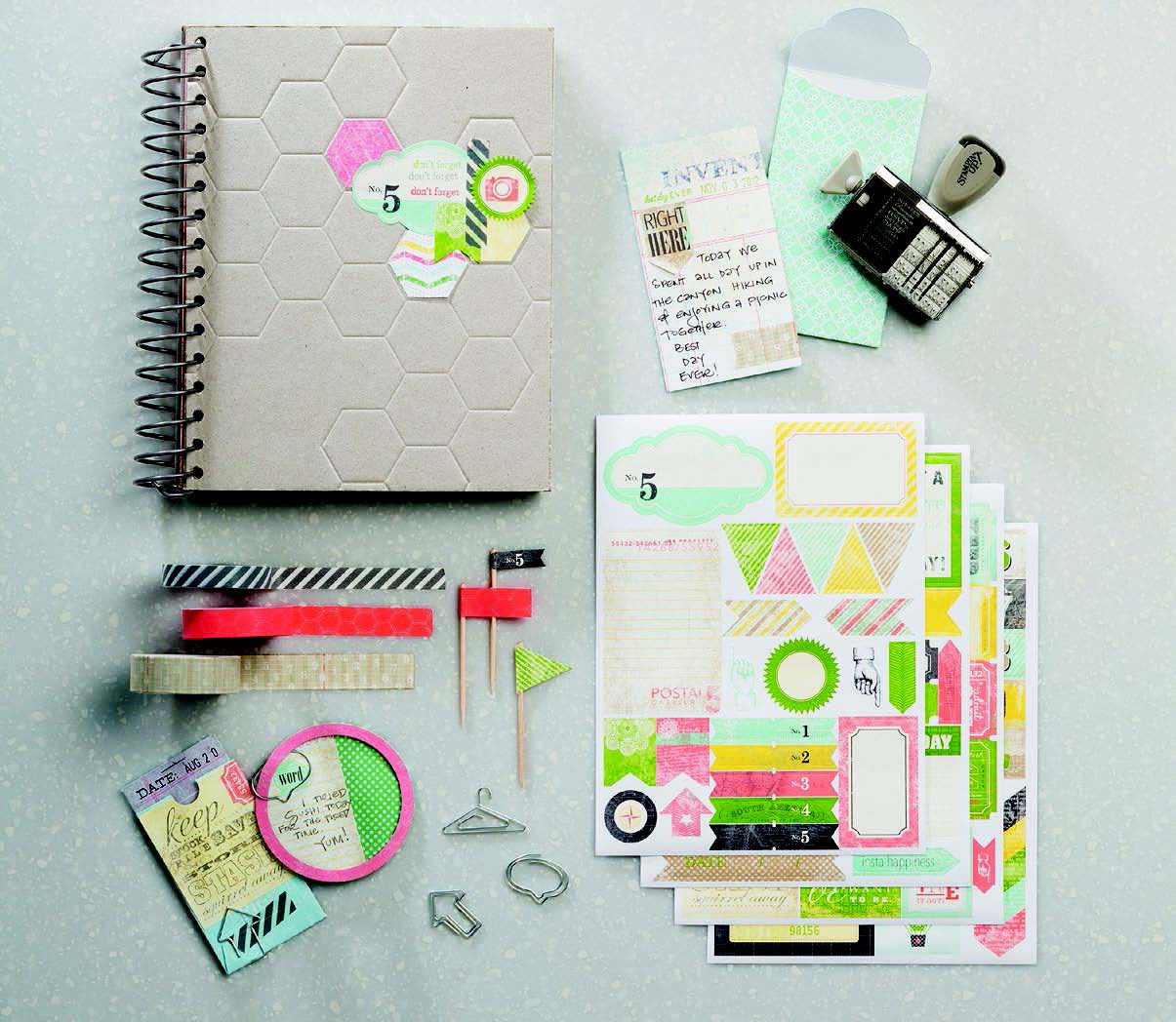 Dieses Buch ist geringt , vorne geprägt, mit Seiten aus Designpapier und kleinen Taschen und Kuverts. Dazu gibt es u.a. einen coolen Datumsstempel in deutsch, großartige Sticker (in englisch), tolles Designpapier und farblich passende Washi Tapes, ... genial - oder??