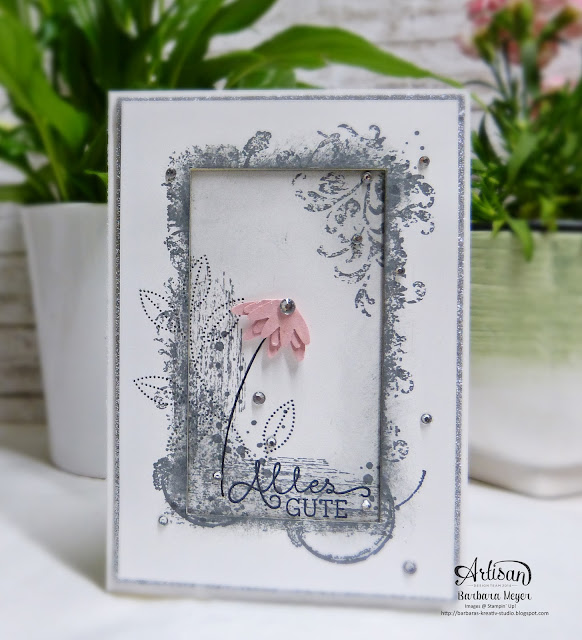 Mit dem tollen Stempelset Timeless Textures bekommt dieses wunderschönen Hintergrund gestempelt. Die Blüte ist mit der Stanze Dreierlei Blüten gestanzt und die Blüten einfach passend zuschneiden.